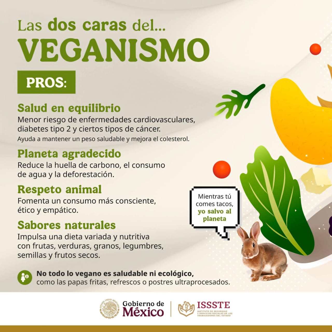 Al mismo tiempo, compartimos con usted que el pasado 1 de noviembre nos dio gran satisfacción observar por primera vez, en las redes sociodigitales del ISSSTE una infografía sobre veganismo. La información presentada promueve un estilo de vida que fomenta la salud, respeta a los animales y contribuye al cuidado del planeta, aspectos con los que coincidimos plenamente.